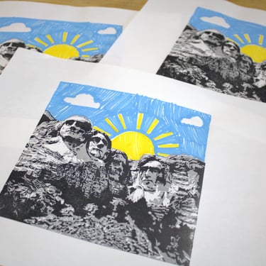 6″ × 6″ hand-printed 2 color linocut on 8.5″ × 11″ 100% cotton paper that has been hand-tinted with acrylic markers